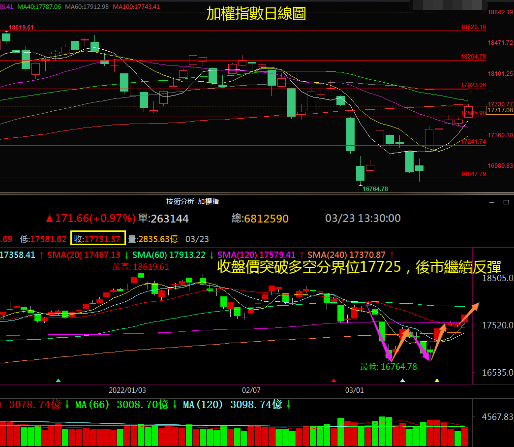 3月23日週三加權指數受隔夜美股四大指數全數勁揚激勵跳空開高走高收於17731.37點,放量突破短期多空分界位17725,後市將維持反彈並形成日線級別的雙底看漲形態作用於上方壓力位17923附近。週線上看,週K線再次下穿中短期週均線組後,再次虛假下破60週均線位幾多空分界位17100後站上5週均線位,後市需等待17920~18060壓力區附近的方向選擇;MACD指標綠色柱狀線維持放大後開始縮小逐步展開回彈走勢,相對強弱指標短期RSI下破50中軸位幾長期RSI後向上拐頭且開始臨近該長期RSI指標線,總體看週線目前是強勢區回撤跳空下破20週均線位,2次測試60週均線位均虛假破位下探後的回彈走勢;目前可靠企穩5幾60週均線位形成週線級別雙針探底的看漲組合形態,後市等待週線級別K線突破所有中短期週均線組後在17920~18060壓力區附近的方向選擇,如果放量突破18060則日線級別轉為強勢區運行,否則無法放量突破18060將產生整理或者重拾日線級別的下跌趨勢。目前上方壓力區為17920~18060多空分界位為18060,下方支撐區為17585~17445,下方多空分界位為17445。