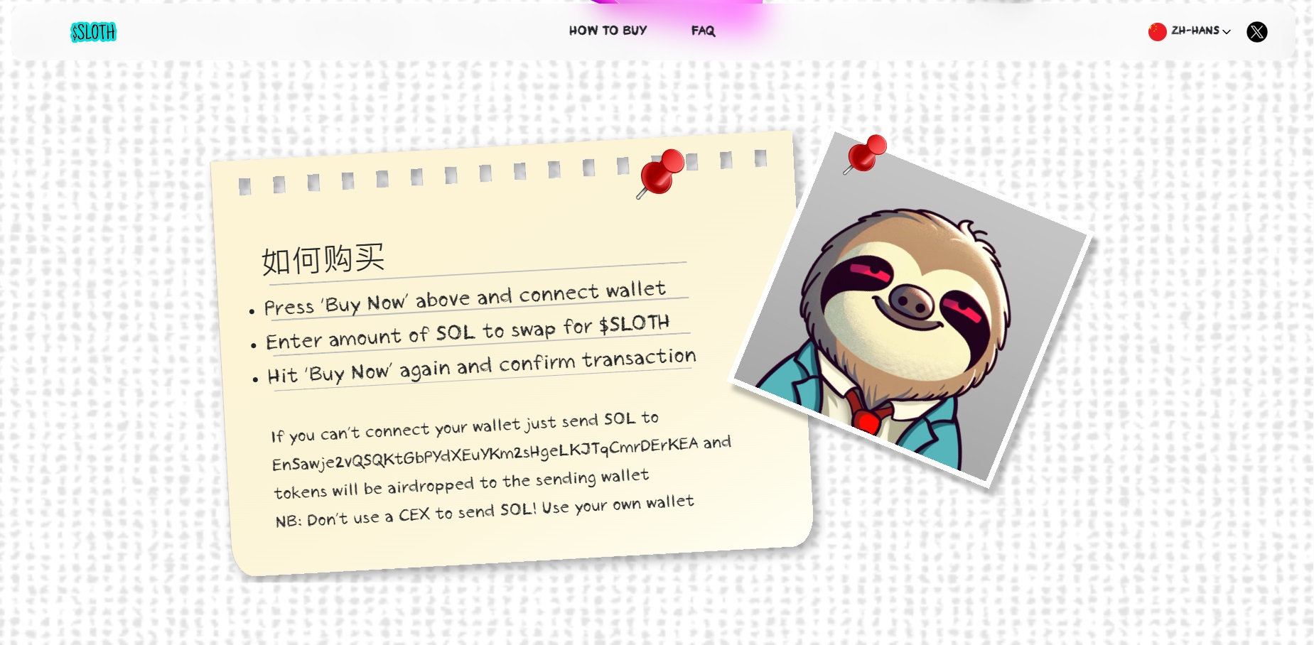 要獲得 SLOTH,用戶必須將 SOL 發送到 Slothana 的合約,或者將錢包直接連接到項目的網站來購買資產。