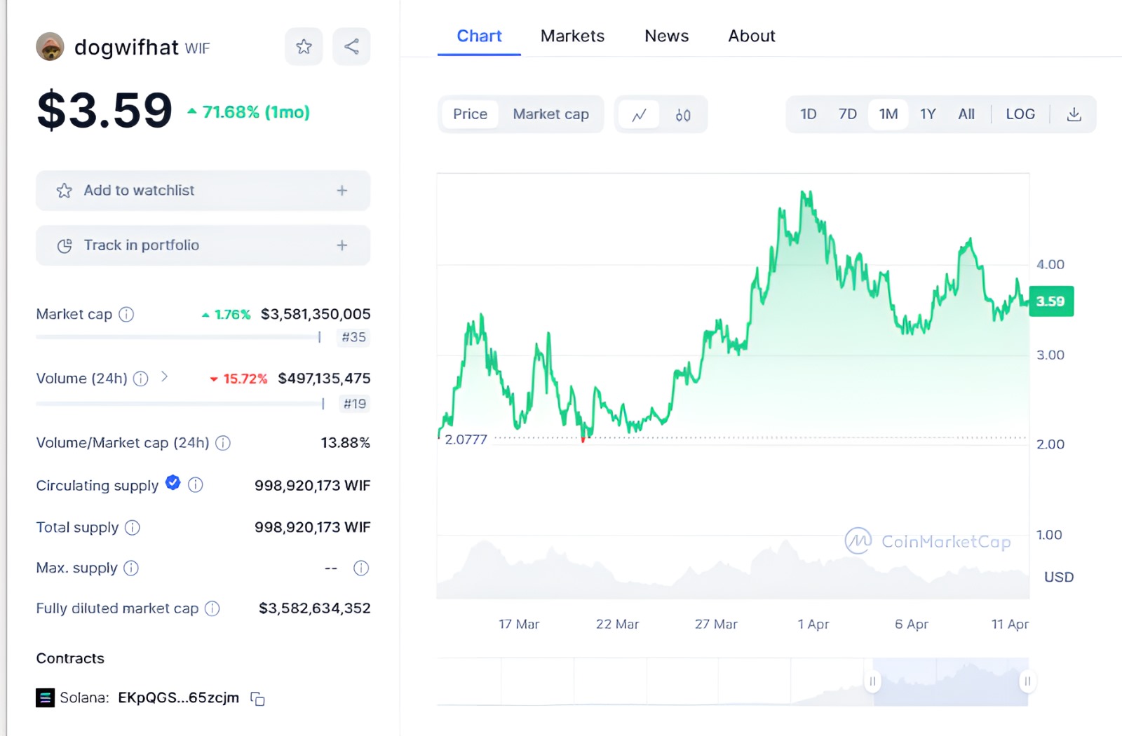 Dogwifhat在2024年3月31日達到歷史最高價格4.80美元,當前WIF週期高點為4.30美元,週期低點在3.21美元。WIF最近顯示出高波動性,該幣的1個月波動率為23.42%。Dogwifhat在過去30天錄得16個漲幅日。