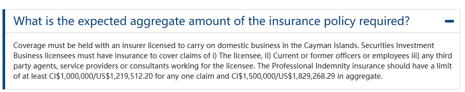 從開曼CIMA官方給出的規定來看,購買PI保險最低保額標準是100萬開曼元,折合122萬美元左右,這和英國FCA最低100萬英鎊的最低標準基本上是一致的。