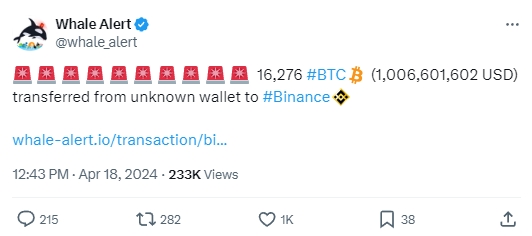 周五,Whale Alert監測顯示,16276枚比特币,價值約合1006601602美元,從未知錢包轉移到币安。