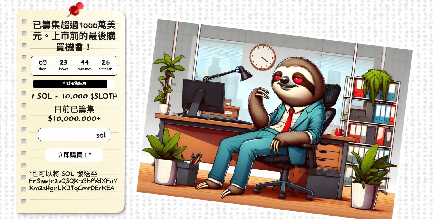 Slothana ($SLOTH)是一種基於Solana新迷因加密貨幣,正在吸引大量投資者的關注。與傳統的預售活動不同,Slothana 允許投資者直接將 $SOL 發送到項目的錢包位址,以換取 $SLOTH 空投。這種獨特方法簡化投資流程,且無需分層定價或計時器。