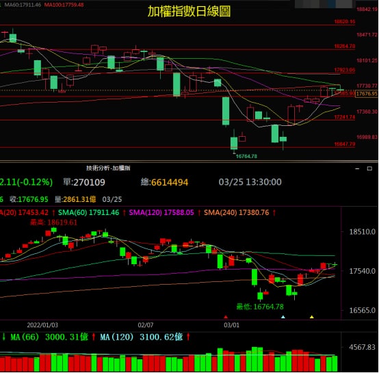 台股上周在外資回頭買超約 160 億元,單周強彈 220 點,周線連 2 紅,站回半年線之上,持續淡化俄烏局勢、通膨等利空,不過因應疫情,上海緊急宣布自今 (28) 日分區分批分時封控,再掀供應鏈危機,加上投信日前連續買超,連假前夕、季底恐有結帳壓力,整體大盤上檔季線仍有壓。