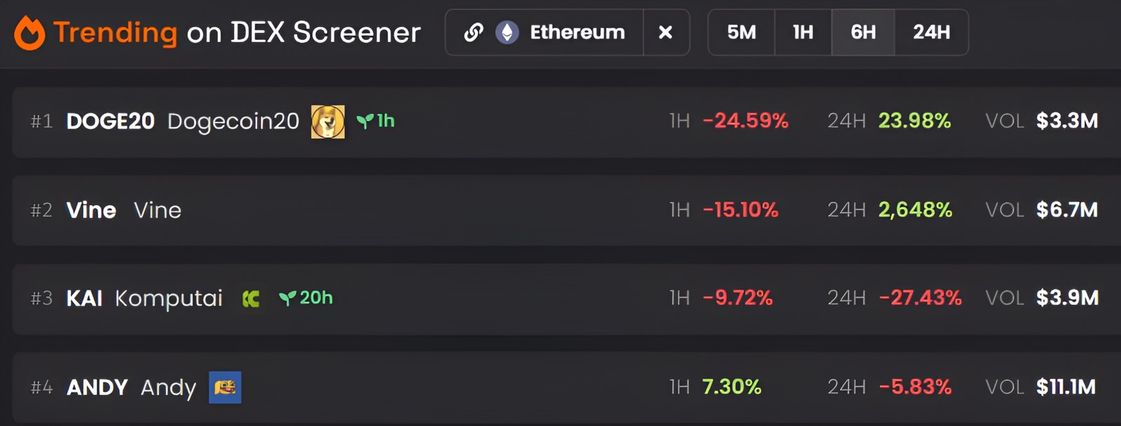 Dogecoin20在其網站上共用了認領通證的合約位址。根據Etherscan,截至發稿時已經有超過1200筆交易。與此同時在DEXScreener等平臺上,DOGE20成為最熱門加密資產之一。