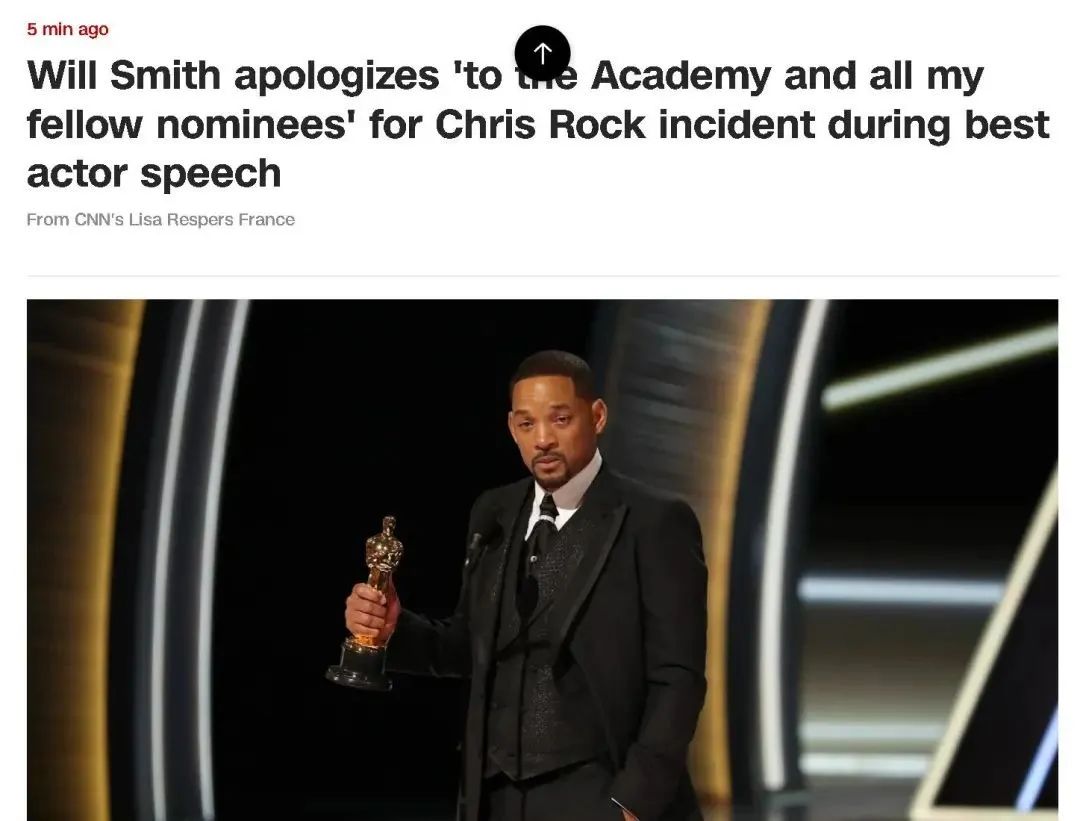 不過,根據美國CNN的報導,在之後首次獲得奧斯卡最佳男主角的獎項後,威爾·史密斯在發表獲獎感言時,含著淚為之前發生的打人一幕道了歉。