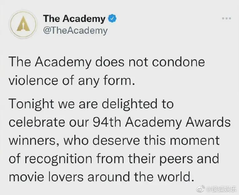 對此奧斯卡官方發文回應:“學院不容忍任何形式的暴力。今晚,我們向第94屆奧斯卡金像獎獲得者表示祝賀。他們值得在這一刻得到全世界同行和影迷的認可。”據悉,洛克已向洛杉磯警方表示拒絕報案。