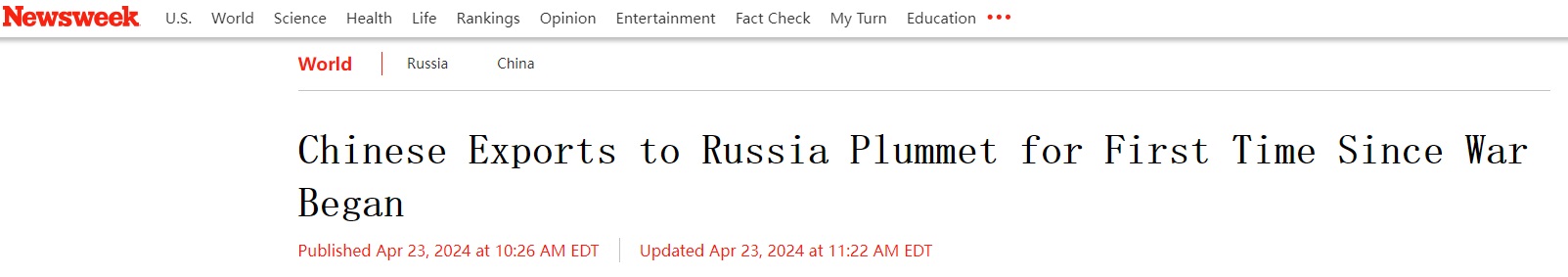 美國《新聞周刊》4月23日報道稱,中國海關數據顯示,上月中國對俄羅斯出口同比下降,這是自2022年俄烏戰争爆發以來的首次。