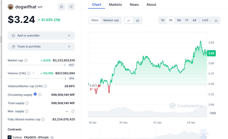 具體來看WIF和BONK的反彈,WIF的價格在4月24日飆升至3.43美元的24小時高點,交易量則增加了可觀的96%。大鯨Ansem抓住了正面市場氛圍,導致了這波交易量激增。