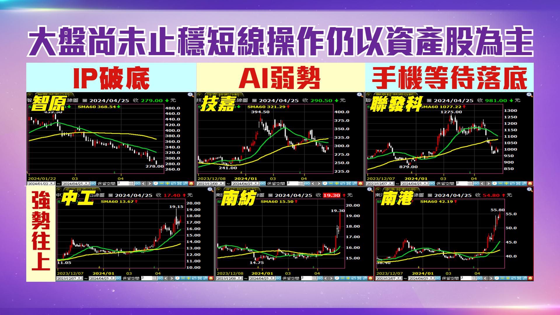 波動率來觀察,整個盤面波動還是加劇,並完沒看到完成止穩的跡象。雖然台股開始往上攻,但是還是特別留意資金的輪動,相對來說是比較快速地。那這裡屬於不要去做追高拉低的動作,應該趁著拉回來做買進,或是逢高來做減碼。短期來說,AI、IP股、手機股還是比較弱勢,還是以傳統資產股為主。