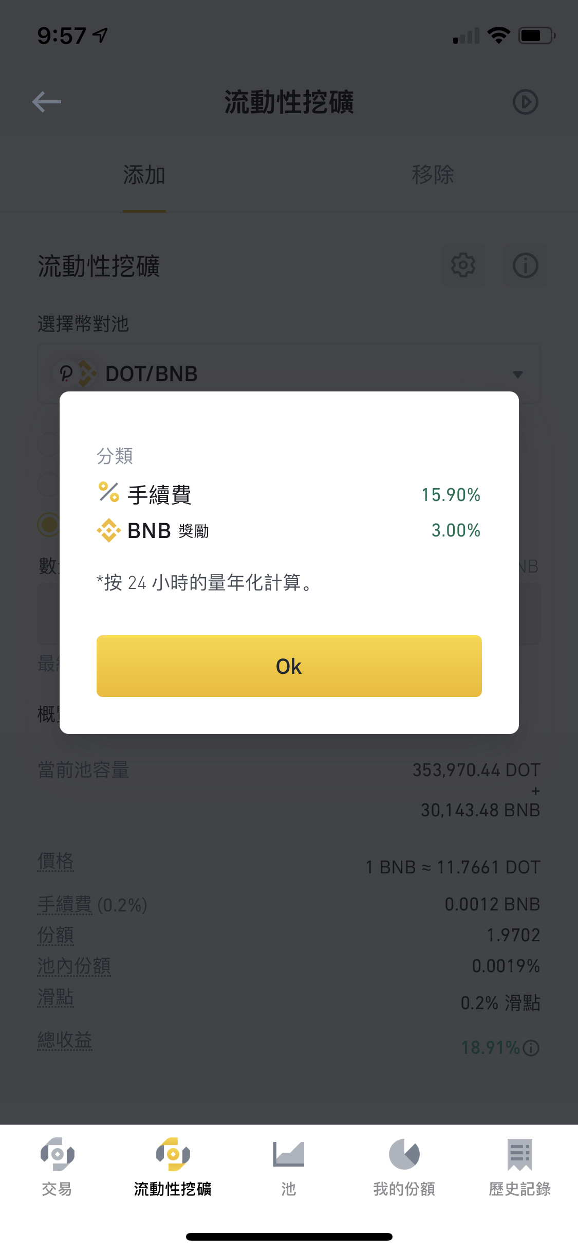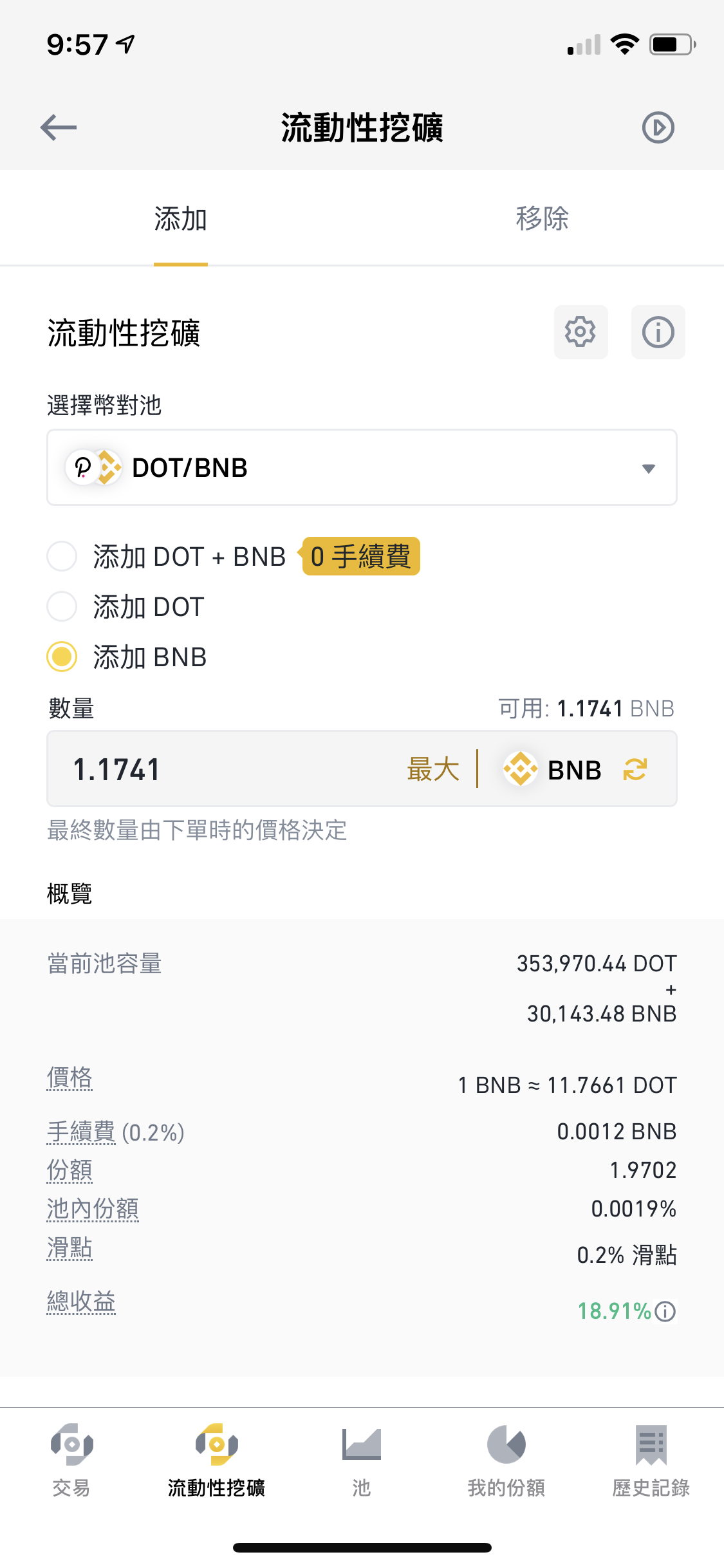 最近研究了一下Defi平台上的「流動性挖礦」,發現對我這種長期持幣的投資人來說是另一種持幣增加額外收益的好方法,透過提供持有的幣到幣安流動礦池就可收取池內手續費份額的分潤收益💰,小小先拿BNB搭配波場DOT交易對來測試一下!祝我好運👍