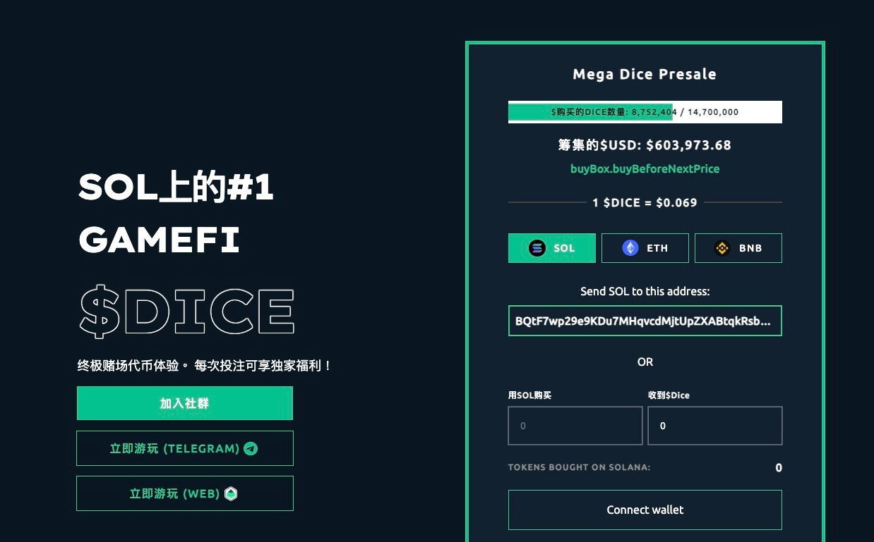 近日Solana生態中最火熱的新GambleFi代幣Mega Dice($DICE)的預售已經籌集了60萬美元的投資,根據代幣官網資料顯示。Mega Dice去年作為全球第一家通過熱門消息應用Telegram訪問的授權加密賭場推出。自那時起,已經有5萬玩家註冊並幫助賭場成為GambleFi中一個知名品牌。競爭對手紛紛仿效,在Telegram上推出競爭的博彩機器人,最著名的是TG Casino。