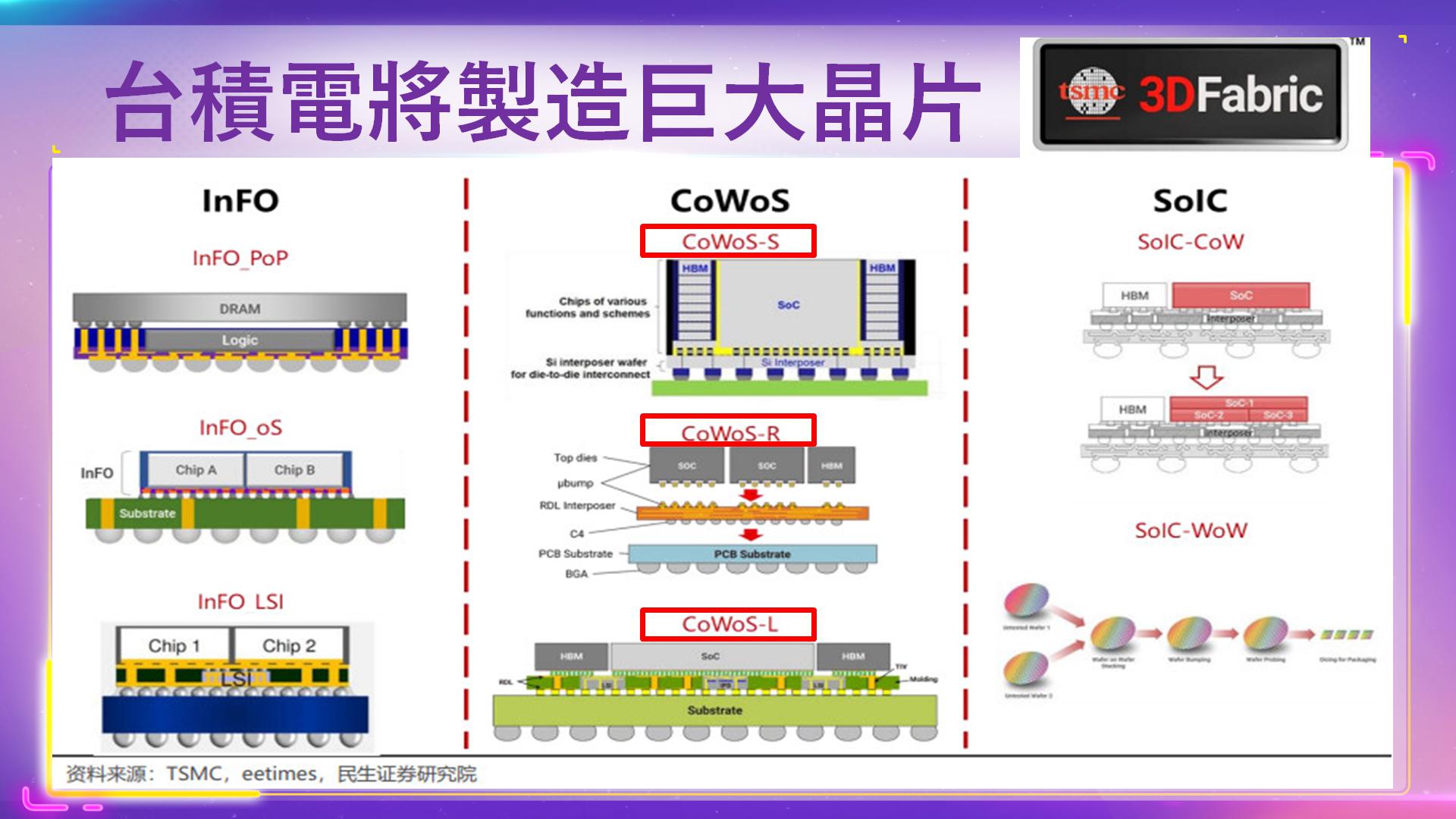 台積電在論壇上宣布,該公司正研發 CoWoS(基板上晶圓上封裝)先進封裝技術的下個版本,打算在2027推出12個HBM4E堆疊的120x120mm晶片,可讓系統級封裝(SiP)增大兩倍以上,將達成120x120mm的超大封裝,功耗可達數千瓦。根據採用的不同的矽中介層,台積電把CoWoS封裝技術分為CoWoS-S、CoWoS-R及CoWoS-L三種類型,CoWoS能夠提高系統性能、降低功耗、縮小封裝尺寸,也為台積電在後續的封裝技術保持領先奠定了基礎。