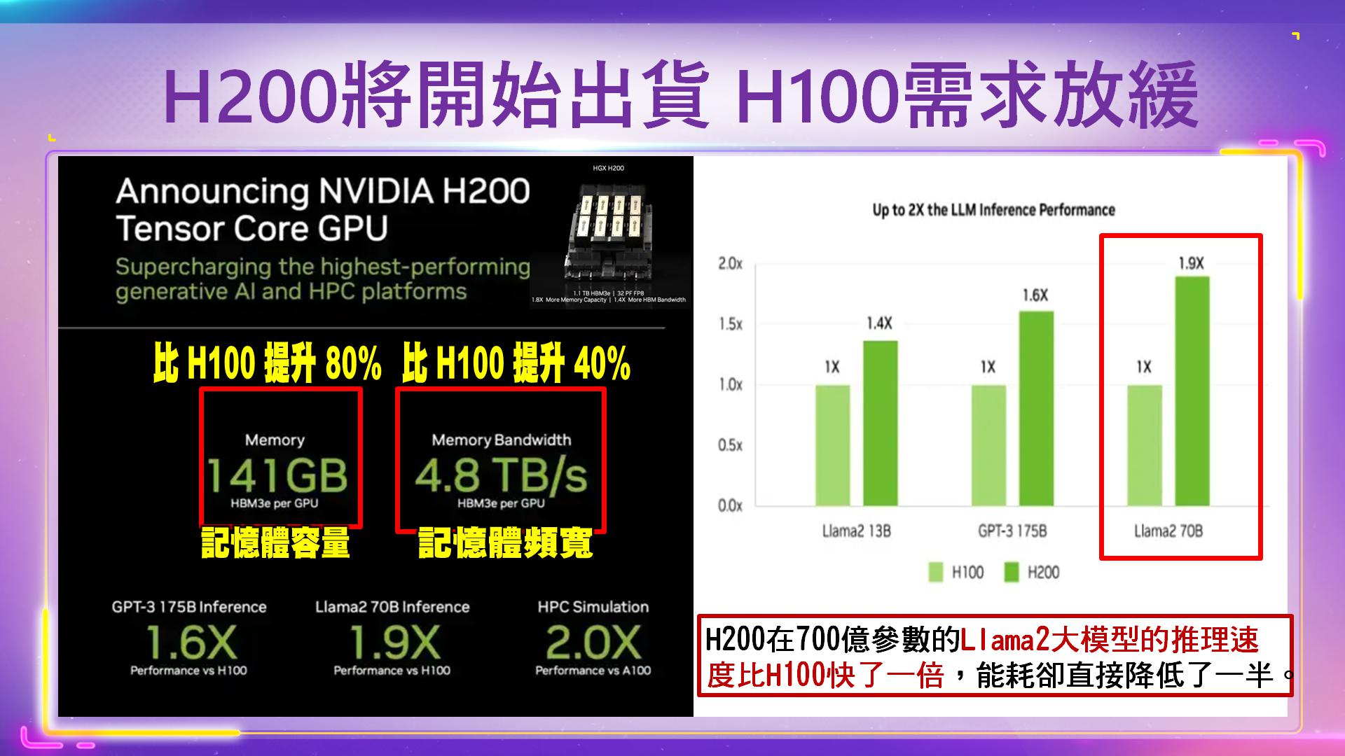 根據輝達的介紹,H20在性能方面比H100提升約60%到90%,並採用H100相同的Hopper架構,因此它們的浮點速率基本相同。在主要升級方面,H200重點轉向記憶體容量跟頻寬,包括141GB的HBM3E記憶體,比H100提升80%,頻寬則從H100的3.35TB/s增加到4.8TB/s,提升40%。值得注意的是,H200在大語言模型 (LLM) 推理表現上的性能提升極其明顯,H200在700億參數的Llama2 大模型的推理速度比H100快了一倍,能耗卻直接降低了一半。