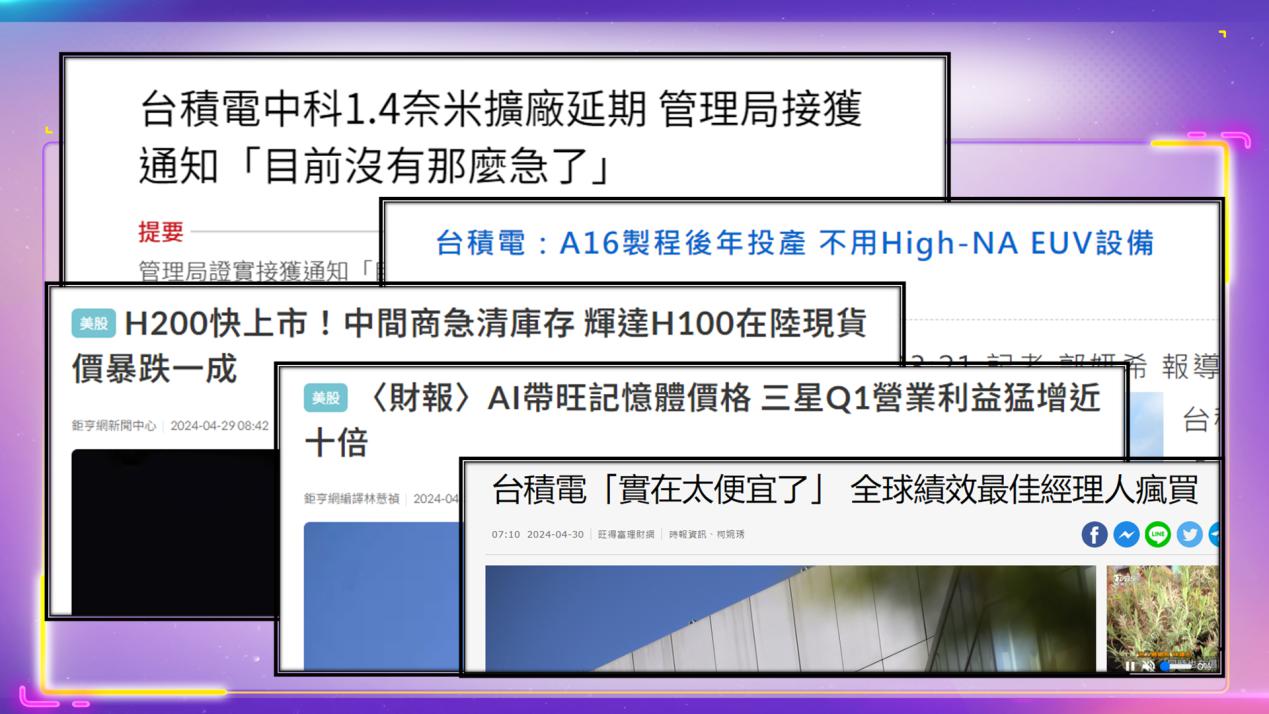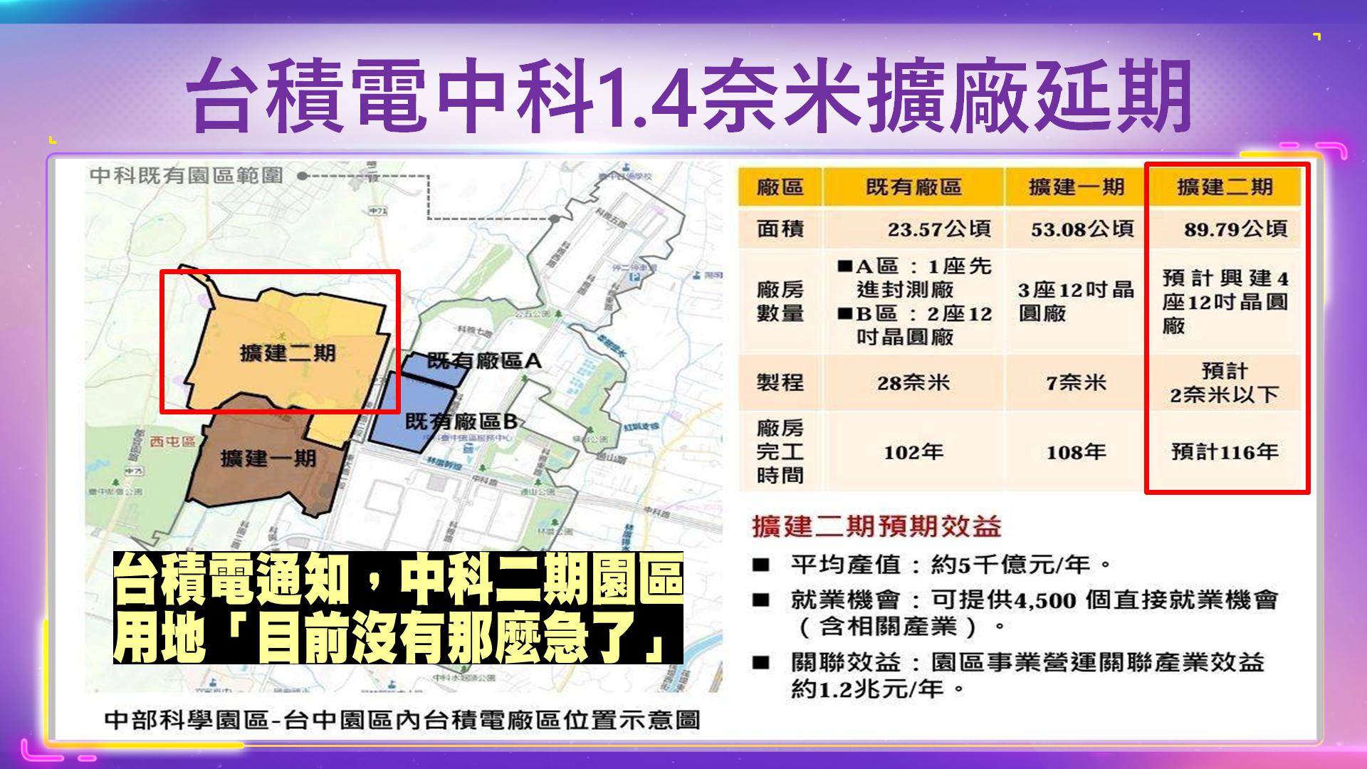 至於為何延後中科擴廠?台積電供應鏈分析,台積電日前在北美技術論壇中強調,2奈米需求強勁,預計2025年量產,加上最新發布的的A16製程預計2026年量產,因應市場及客戶需求;中科1.4奈米製程「反而沒有那麼急迫」,研判應是將重點先放在加速推進2奈米及A16製程。
