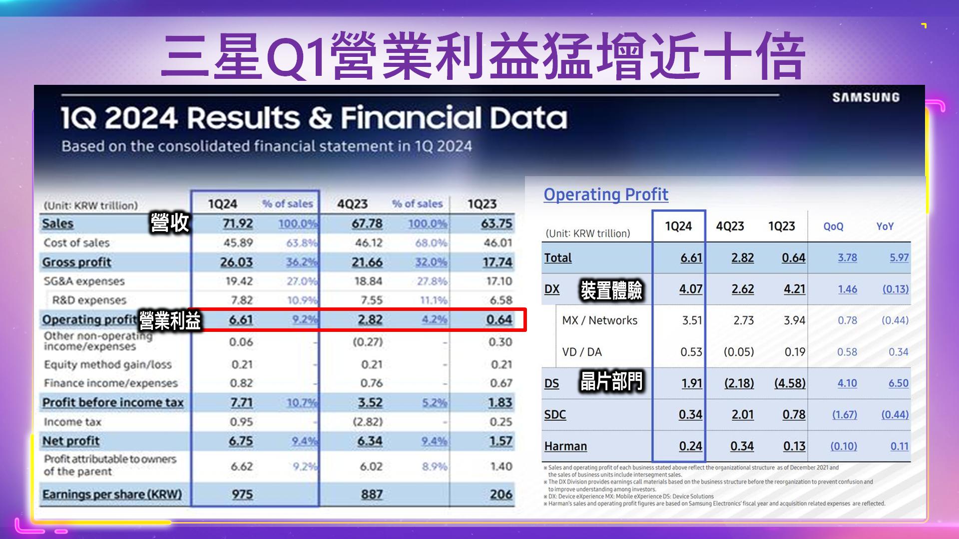 三星電子(005930-KR) 04/30公布,因人工智慧(AI)樂觀情緒帶動記憶體價格反彈,第一季營業利益猛增近10倍。三星於04/30聲明:因 Galaxy S24 旗艦智慧手機銷售強勁,加上記憶體價格上漲,上季合併收入達到71.92兆韓元。此外,藉由滿足高附加價值產品需求,帶動記憶體業務重返獲利,營業利益增至6.61 兆韓元。