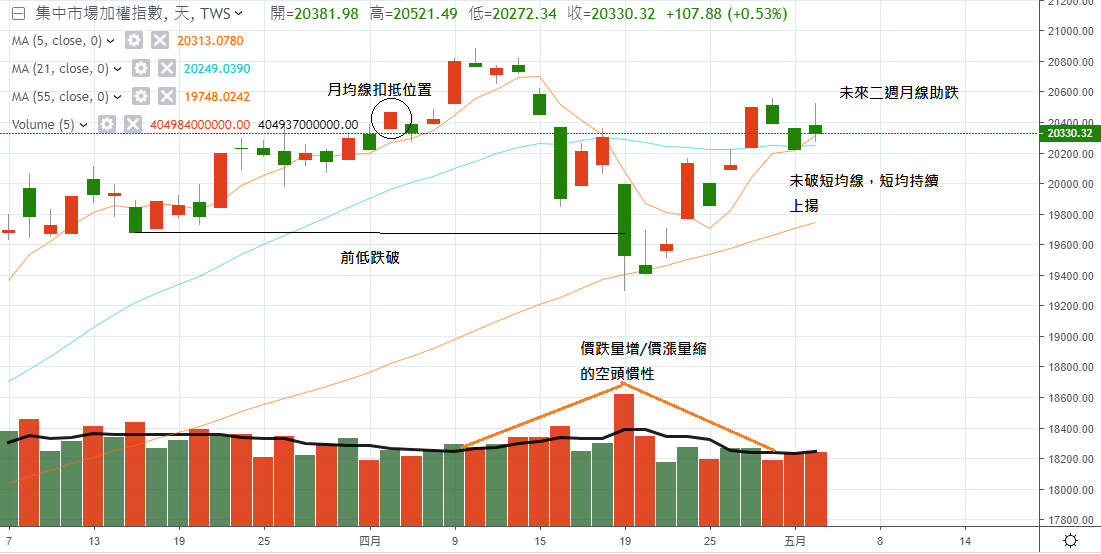 4月中旬的回檔趺破月線及前波低點,再轉折向上先視為反彈,逄高要減持。