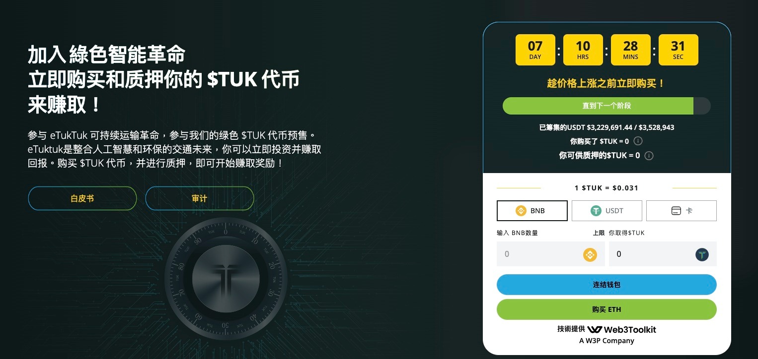 比特幣近日出現波動,投資人部署時不妨留意不同產品,如獲得幣安BNB鏈的鼎力支持的eTukTuk。 eTukTuk是一種新的綠色加密貨幣,旨在促進發展中國家三輪車環保能源交通,並通過利用區塊鏈來縮小發展中國家的經濟差距。