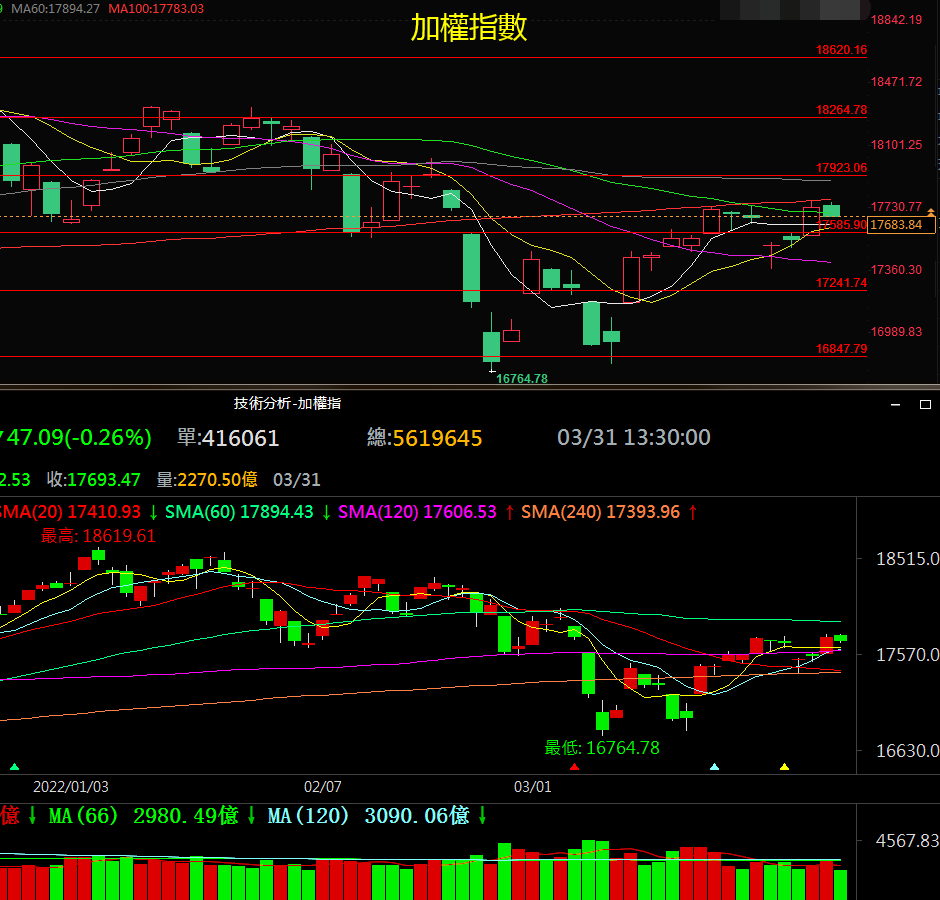 台北股市大盤走勢昨日以金融股的急拉的走勢力抗電子股族群的賣壓,終場大盤以下跌 47.09 點或 0.27%,收在 17693.47 點,成交值 2315.58 億元,長假前較大賣壓恐在今天出現,但目前觀察大盤仍將守住半年線的震盪為台股大盤主要格局。