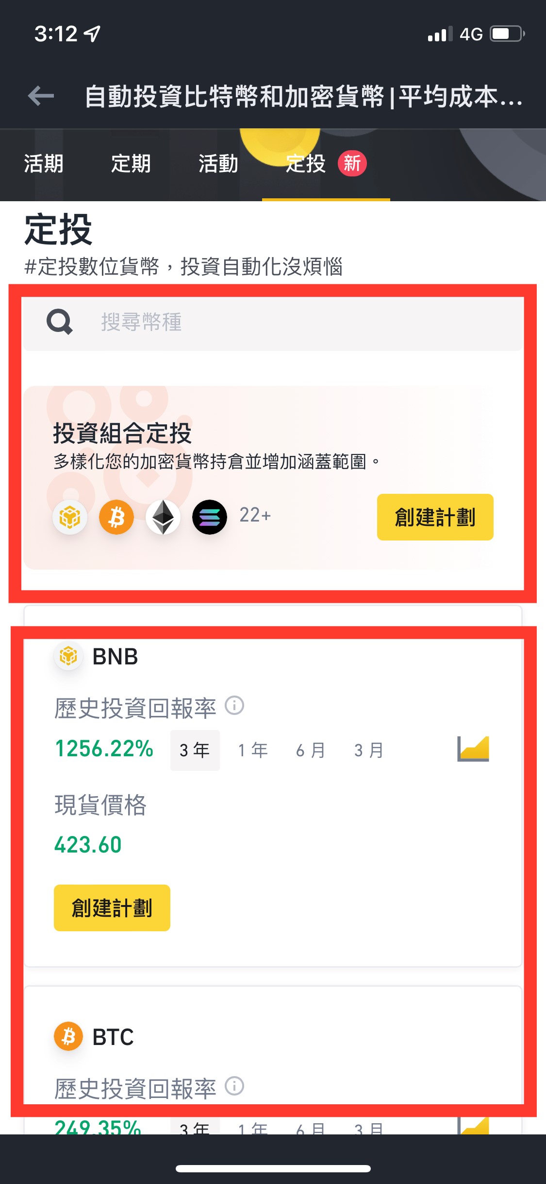 可以透過畫面看到相關定投主流幣的歷史投資回報率:分為3年/1年/6個月/3個月, 挑選自己覺得適合的幣[創建定投計畫]