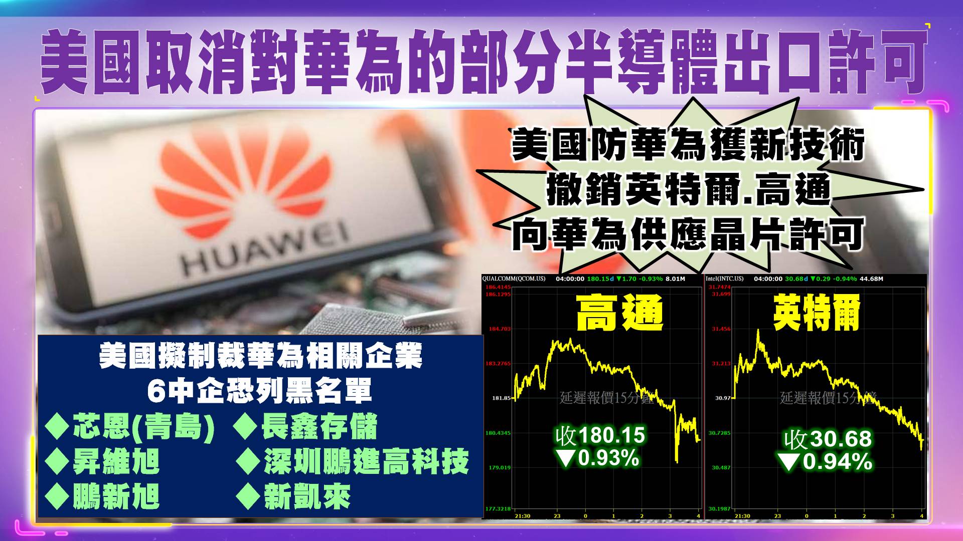 根據《彭博社》2024/3/20的報導:知情人士透露,可能被列入黑名單的公司包括晶片製造商青島芯恩、昇維旭、鵬新旭、長鑫存儲,以及半導體製造設備商鵬進高科技以及新凱來。消息出爐後,高通股價2024/5/7收盤下跌0.93%至每股180.15美元;英特爾也跌0.94%至每股30.68美元。