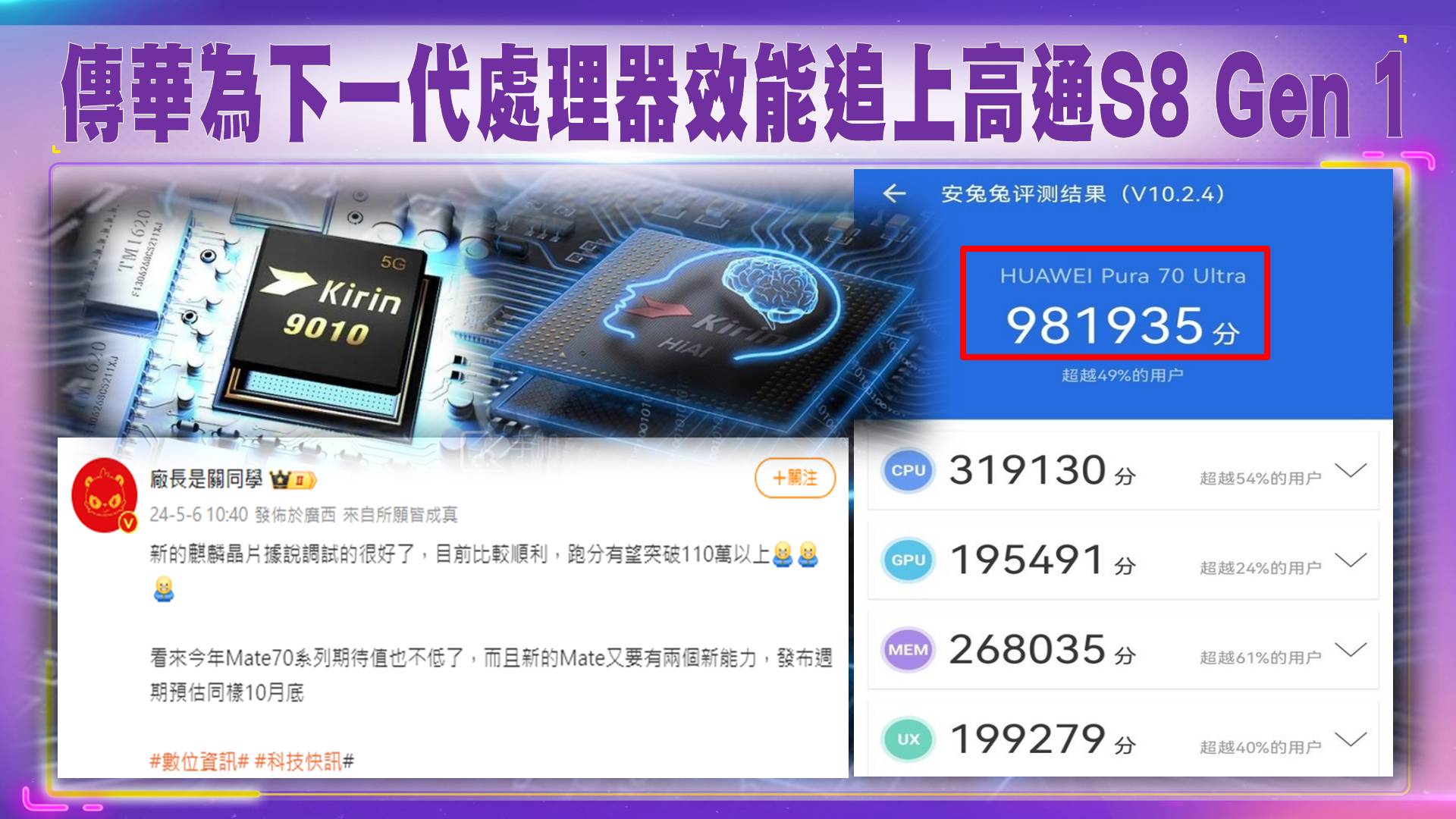 華為發表的Pura 70系列帶著新的 Kirin 9010 處理器登場,有消息指出下一代 Kirin 處理器效能將進一步升級,有機會追上高通 S8 Gen 1 的效能。