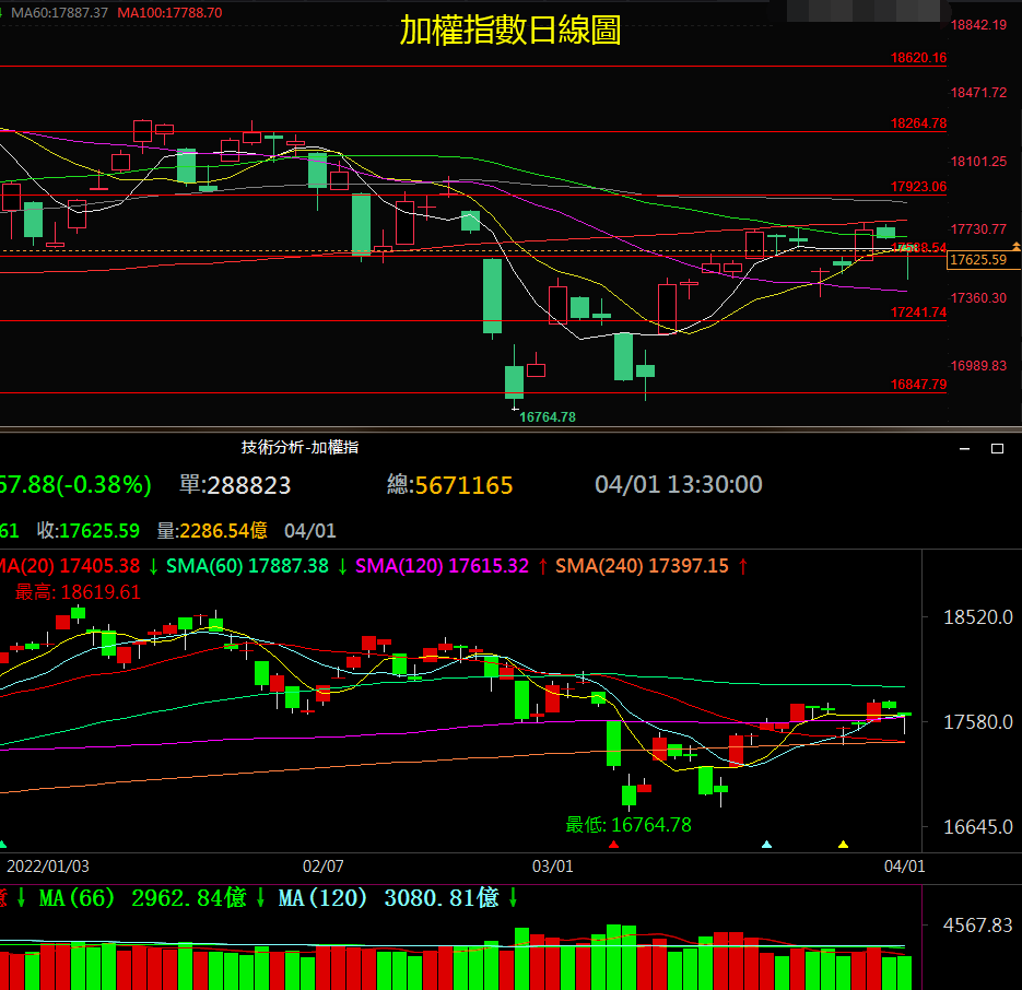 4月1日週五加權指數受隔夜美股普跌激勵開低走低較上一日出量收出一根小實體偏整理的陰線,下探多空分界位17445上方附近獲得支撐收出一根較長下影線實體較小的蜻蜓線,預示下方支撐作用較強;形態上看加權指數回撤日線級別雙底形態的頸線位獲得支撐,整理儲能後作用於【17585,17923】區間中位受壓下行至多空分界位17445上方展開回彈整理走勢。週線上看,週K線雙針探底60週均線位後目前再次展開回彈走勢,後市需等待17920~18060壓力區附近的方向選擇;MACD指標綠色柱狀線放大後開始縮小,相對強弱指標短期RSI下破50中軸位幾長期RSI向上拐頭經過整理後在50中軸位附近走平,表明目前行情再次展開整理走勢,總體看週線目前是強勢區回撤跳空下破20週均線位,2次測試60週均線位均為虛假破位,目前企穩60週均線位形成週線級別雙針探底看漲組合形態後的整理走勢,後市需等待週線級別K線突破所有中短期週均線組在17920~18060壓力區附近選擇後續運行方向,如果放量突破18060則日線級別轉為強勢區運行,否則無法放量突破18060將產生整理或者重拾日線級別的下跌趨勢。目前上方壓力區為17920~18060多空分界位為18060,下方支撐區為17585~17445,下方多空分界位為17445。