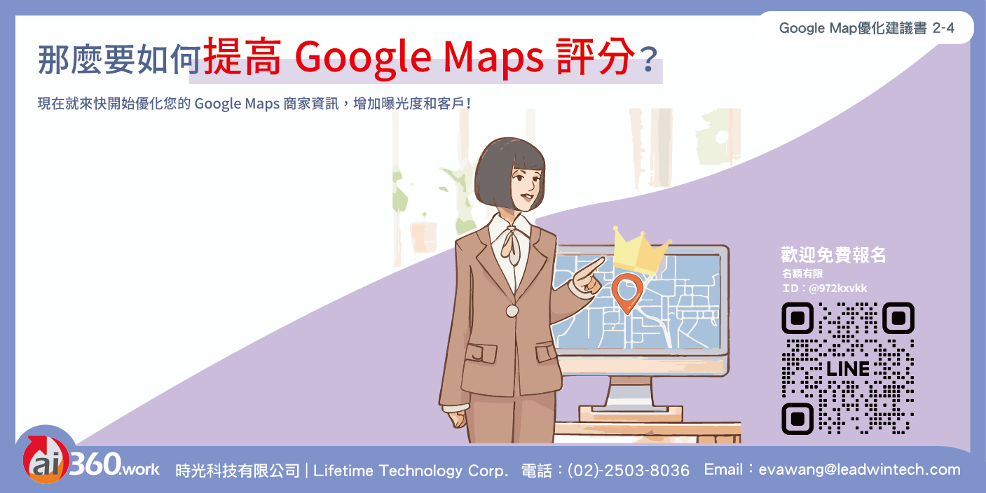 因此,我們強烈鼓勵您優化您的 Google Maps 商家資訊,讓您的公司能夠被更多人看見。現在就來快開始優化您的 Google Maps 商家資訊,增加曝光度和客戶!