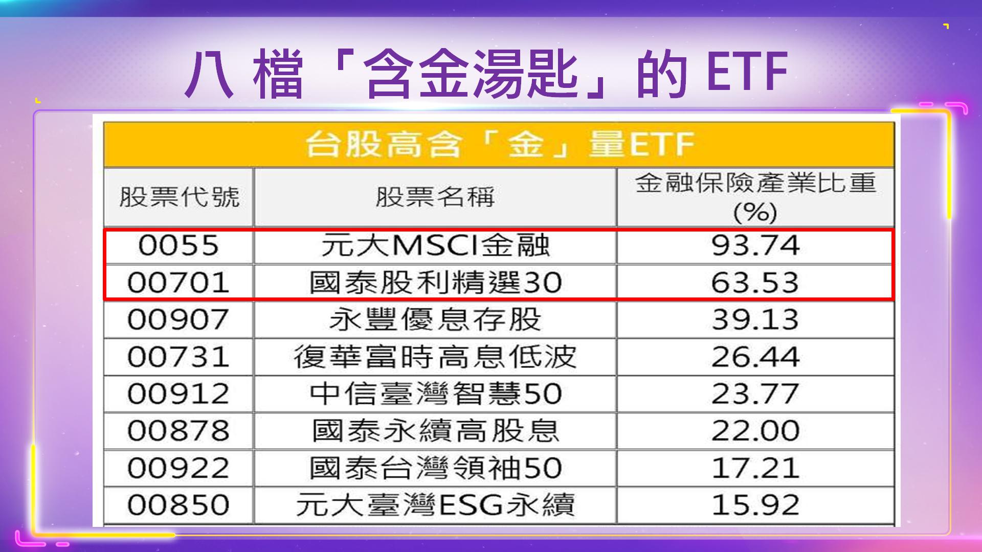 除權息旺季即將到來,多家金控、銀行接連報喜,釋出大方配股、配息利多,帶動金融股鹹魚大翻身,接棒AI概念股躍居盤面人氣指標,存股族除了追逐高殖利率金融股外,投資人亦可透過8檔「含金湯匙」的ETF投資一籃子股票分散風險,掌握企業獲利成長契機。