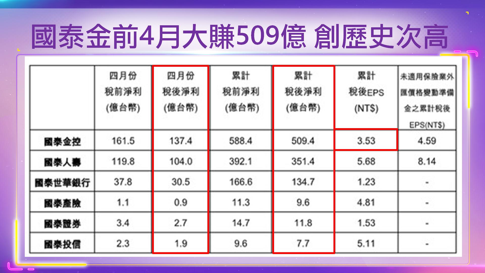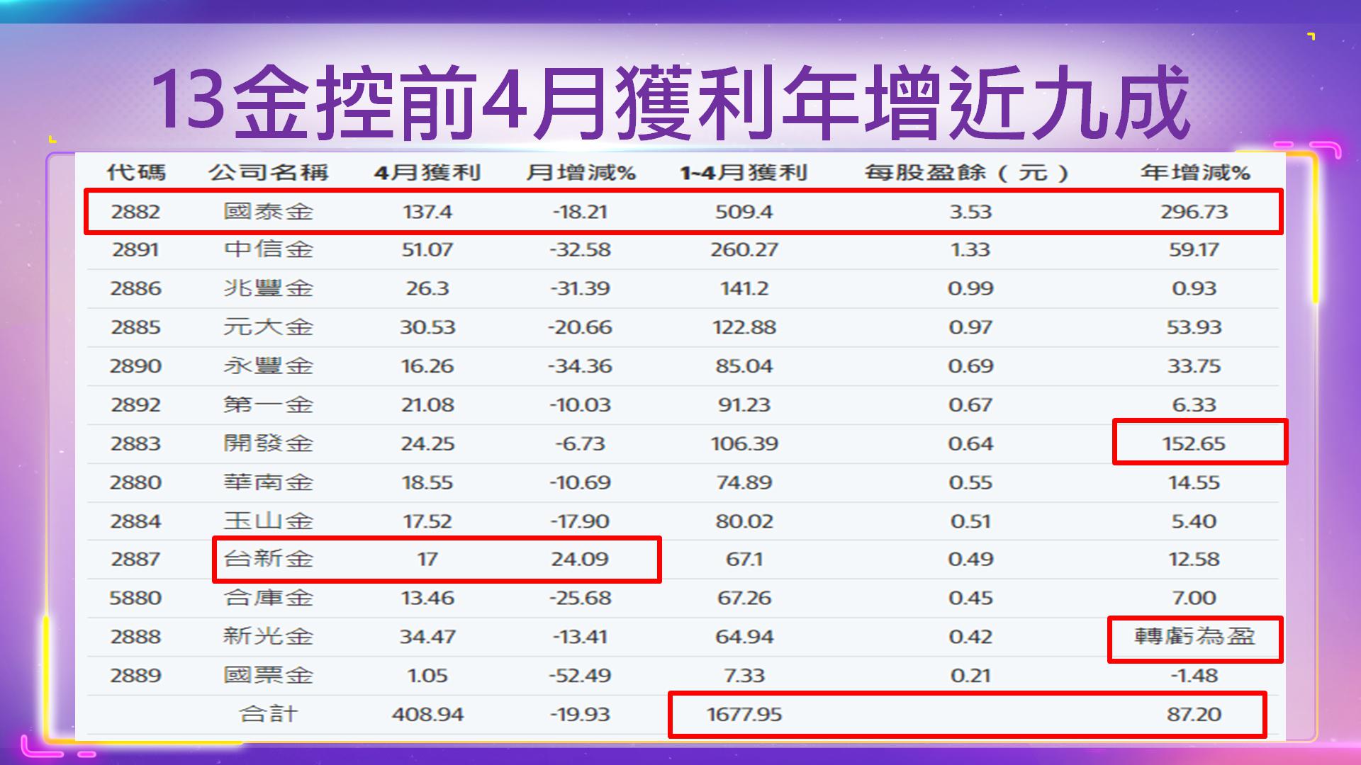 13家金控前四月獲利出爐,已經逼近2,000億元,在僅剩富邦金(2881)尚未公布4月獲利之下,預期整體金控前四月獲利可望飛越2,000億元大關,維持歷史次高與高成長的佳績,國泰金(2882)前四月年增近三倍,每股稅後純益(EPS)3.53元仍暫居冠軍。前4月獲利累計金額,已經賺超過百億元以上的,亦有6家金控之多,包括國泰金、富邦金、中信金、兆豐金、元大金與開發金。