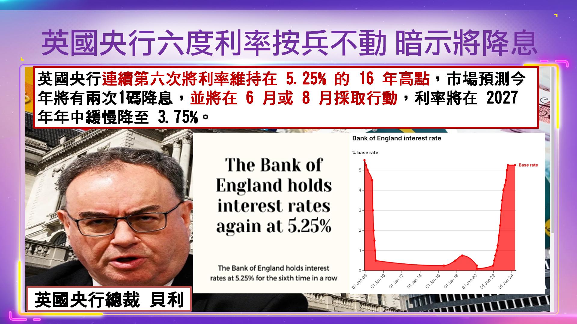 英國央行2024/05/09公布最新利率決策,其貨幣政策委員會以7比2的投票結果,連續第六次將利率維持在5.25%的16年高點,其中後者2票支持降息,較前次投票結果增加一票,暗示降息周期即將到來。此次是英國央行連續第六次利率按兵不動,仍處在抑制物價的限制性區間。英國央行貨幣政策委員會其中7 位投票支持利率不變的決策者認為,需要更多證據表明通膨正在降溫,而2名投票支持降息的決策者則認為,對通膨朝著正確方向邁進感到樂觀。
