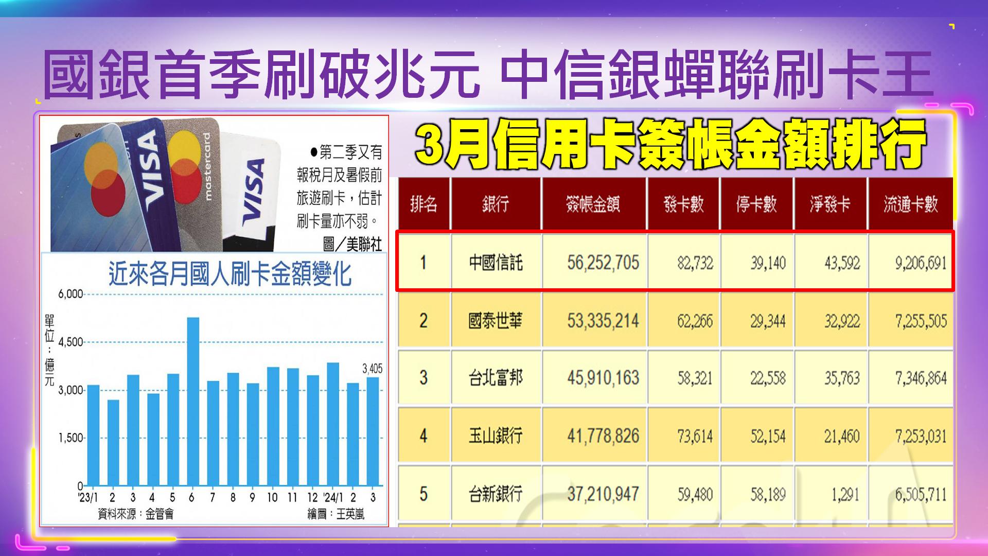 金管會2024/05/09日公布最新統計,全體國銀2024年第一季合計簽帳金額突破 1兆元,達到1兆475.67 億元,年增12.32%,創下歷史同期新高,較2023年同期多出1149 億元,首季信用卡消費力道強勁。而刷卡王寶座仍由中信銀蟬聯,第一季累計刷卡金額達1734億元。截至2024年3月底止,國內共計32家信用卡發卡機構,總流通卡數約 5891 萬張,總有效卡數約 3796 萬張。3 月簽帳金額約3405億元,月增5.81%、年減1.84%。