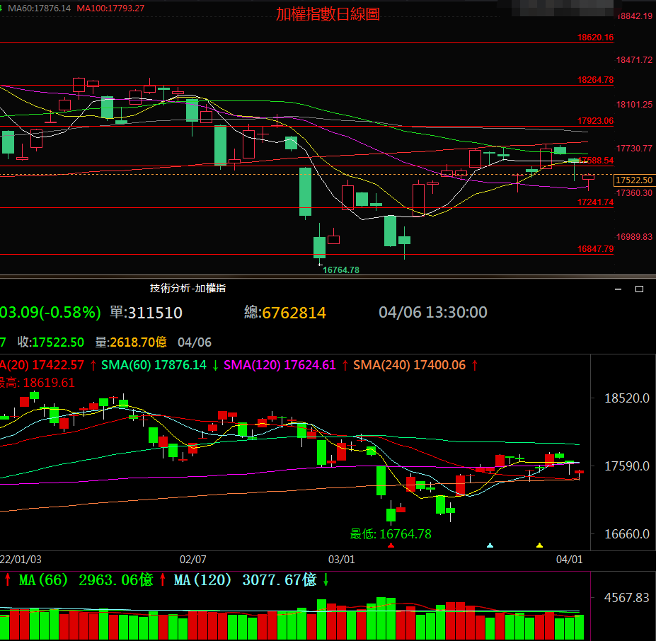 4月6日週三加權指數受隔夜美股普跌激勵開低下行作用於20日均線位後回彈走高但仍然低於上一交易日收盤價103.09點,下探多空分界位17445附近獲得支撐出量收出一根較長下影線實體較小的虛假陽線,預示下方支撐作用較強;形態上看加權指數回撤日線級別雙底形態的頸線位獲得支撐,至多空分界位17445附近展開回彈整理走勢。週線上看,週K線雙針探底60週均線位後目前再次展開回彈走勢,後市需等待17920~18060壓力區附近的方向選擇;MACD指標綠色柱狀線放大後開始縮小走平,相對強弱指標短期RSI下破50中軸位幾長期RSI向上拐頭經過整理在50中軸位附近走平後再次微下拐,表明目前行情再次展開下探整理走勢,總體看週線目前是強勢區回撤跳空下破20週均線位,2次測試60週均線位均為虛假破位,目前企穩60週均線位形成週線級別雙針探底看漲組合形態後的整理走勢,後市需等待週線級別K線突破所有中短期週均線組在17920~18060壓力區附近選擇後續運行方向,如果放量突破18060則日線級別轉為強勢區運行,否則無法放量突破18060將產生整理或者重拾日線級別的下跌趨勢。目前上方壓力區為17920~18060多空分界位為18060,下方支撐區為17585~17445,下方多空分界位為17445。