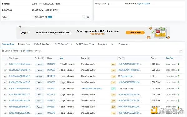 可以發現此地址可能是Opensea冷錢包地址,多筆大額ETH轉至地址0x0b7a434782792b539623fd72a428838ea4173b22,此地址疑似為Opensea熱錢包地址,其中有向多個NFT發行方轉賬行為。