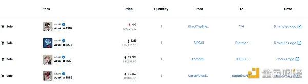 下圖為Azuki系列NFT交易歷史(https://opensea.io/activity/azuki?search[isSingleCollection]=true&search[eventTypes][0]=AUCTION_SUCCESSFUL),來自Opensea Server。