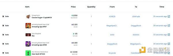 前端頁面Frame裡更新的交易其實來自Opensea服務器索引Opensea在以太坊上的智能合約最新交易後,以Item、Price、Quantity、From、To、Time的形式顯示在Web前端的。