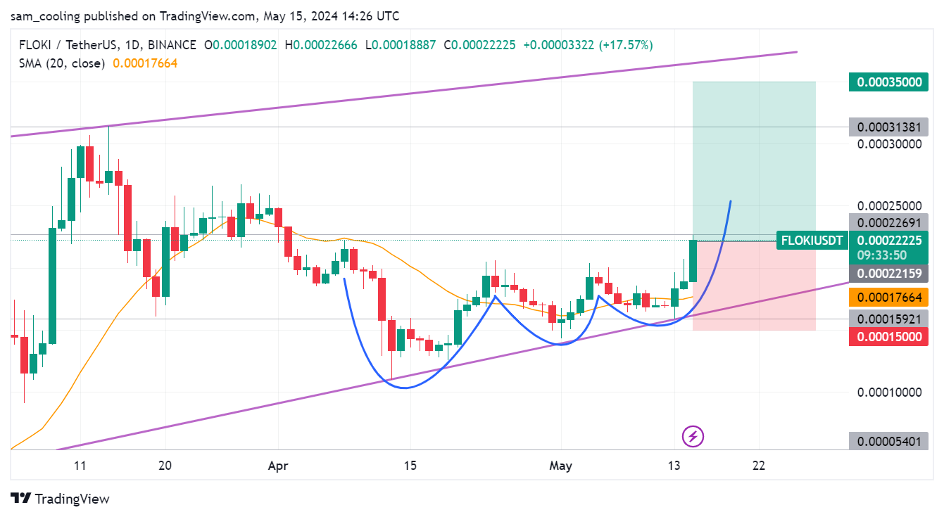 往上看,FLOKI目標是突破歷史最高價,達到0.00035美元(可能成長57%)。