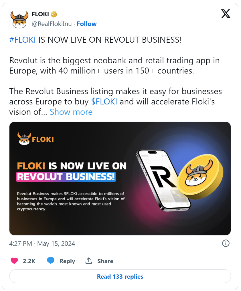 最新的上漲趨勢似乎是由於Floki Inu在Revolut Business上進行了牛市上市,使得歐洲商業帳戶能夠投資FLOKI資產所推動的。