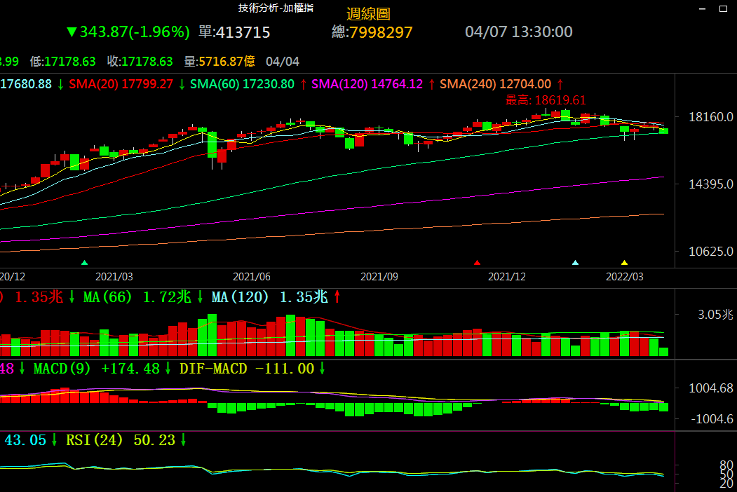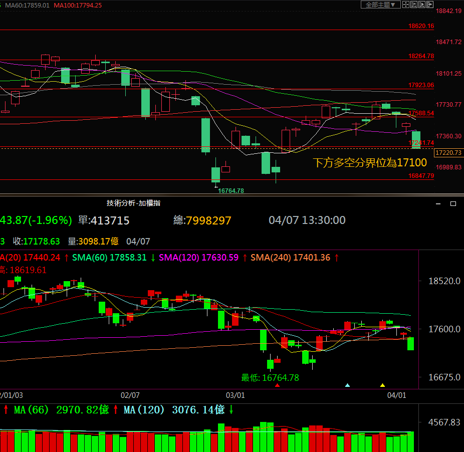 4月7日週四加權指數受隔夜美股再次下跌激勵跳空開低走低,出量開出一根大實體黑K棒,下破多空分界位17445後市需等待下方支撐區17100~17240附近的方向選擇;參考美股三大股指均整理作用於60天均線附近,後市如果美股企穩60天均線位展開上漲時有望帶動台股企穩多空分界位17100上方再次展開反彈走勢;形態上看加權指數3月7日到4月7日正好先形成看漲雙底形態,3月23日受壓100天均線位17740後形成看跌的雙頂形態作用於支撐區17100~17240附近等待選擇後市運行方向。週線上看,週K線雙針探底60週均線位展開回彈走勢,但是受壓20週均線位後再次下探測試60週均線位,後市需等待17100~17240支撐區附近的方向選擇;MACD指標綠色柱狀線放大縮小後再次放大暫時沒有創新低,相對強弱指標短期RSI下破50中軸位幾長期RSI向上拐頭整理後又向下拐頭也沒有創新低,表明目前行情再次展開下探測試走勢,需等待60週均線位附近的方向選擇,總體看週線級別目前是強勢區回檔多次測試60週均線位的方向待定走勢,目前上方壓力區為17580~17725多空分界位為17725,下方支撐區為17100~17240,下方多空分界位為17100。