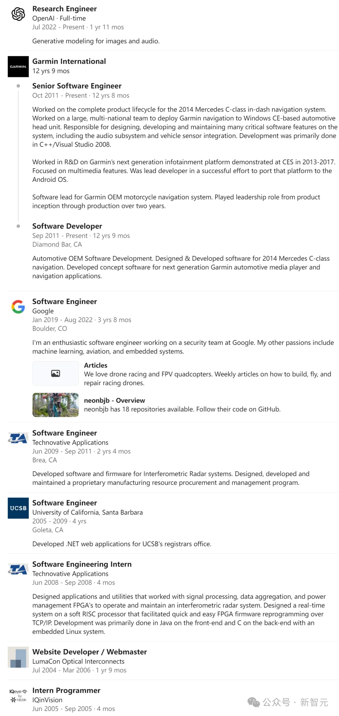隨後,在2107年加入了OpenAI任技術研究員,中間還離職有近一年時間,並在2020年5月再次入職。