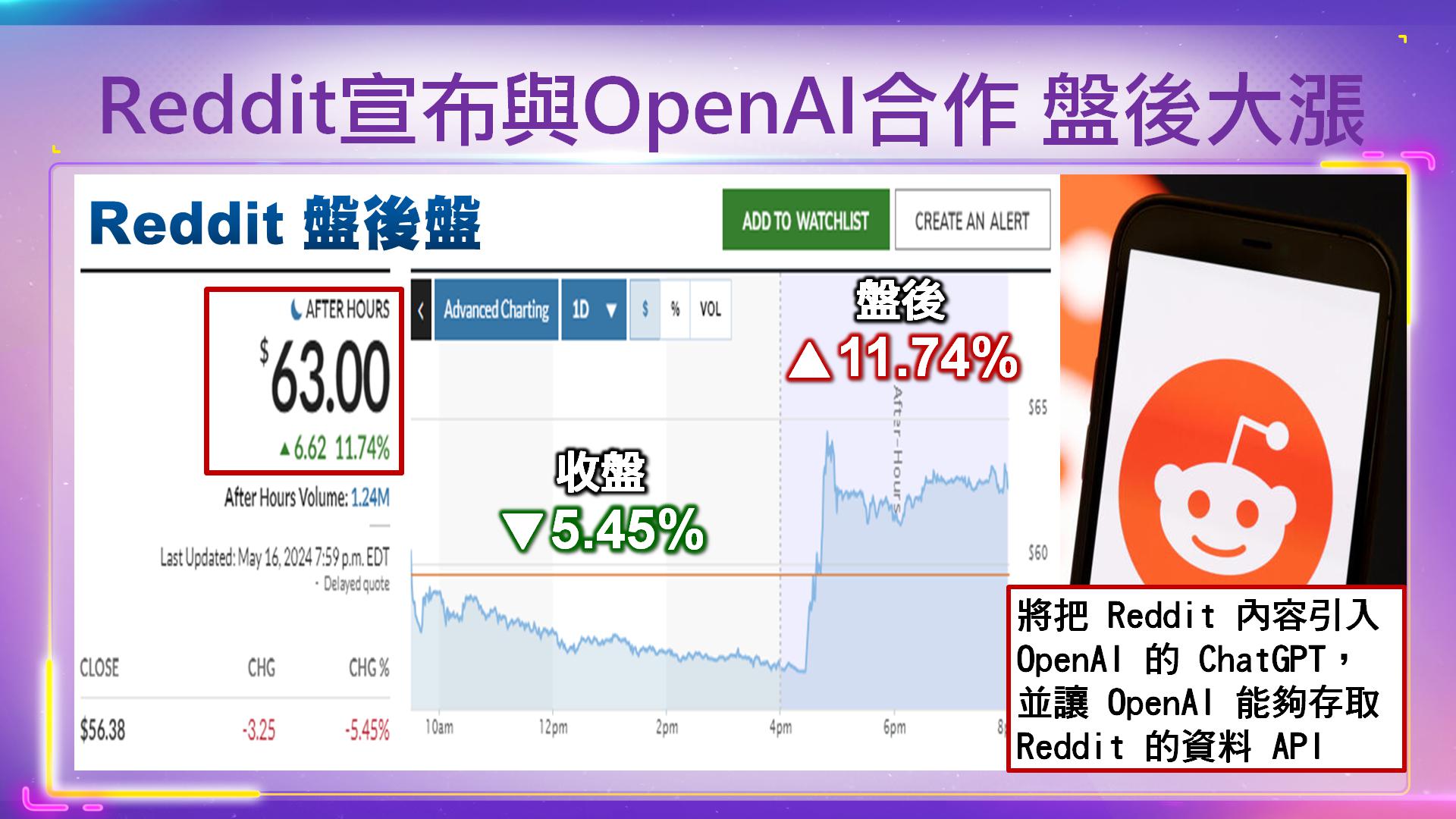 社群媒體平台 Reddit宣布與 OpenAI建立合作夥伴關係後,將其內容導入聊天機器人ChatGPT,Reddit股價週四在盤後交易中飆漲超 11%。該交易將把Reddit內容引入OpenAI的ChatGPT,並讓OpenAI能夠存取Reddit的資料API。Reddit 在一篇部落格文章中表示:「這將使OpenAI的人工智慧工具能夠更好地理解和展示Reddit內容,尤其是最近的主題。」OpenAI也將成為Reddit廣告合作夥伴。Reddit(RDDT-US) 週四下滑超5%,盤後受此消息激勵,其股價翻漲超11%,該股自3月上市以來漲幅已達近12%。