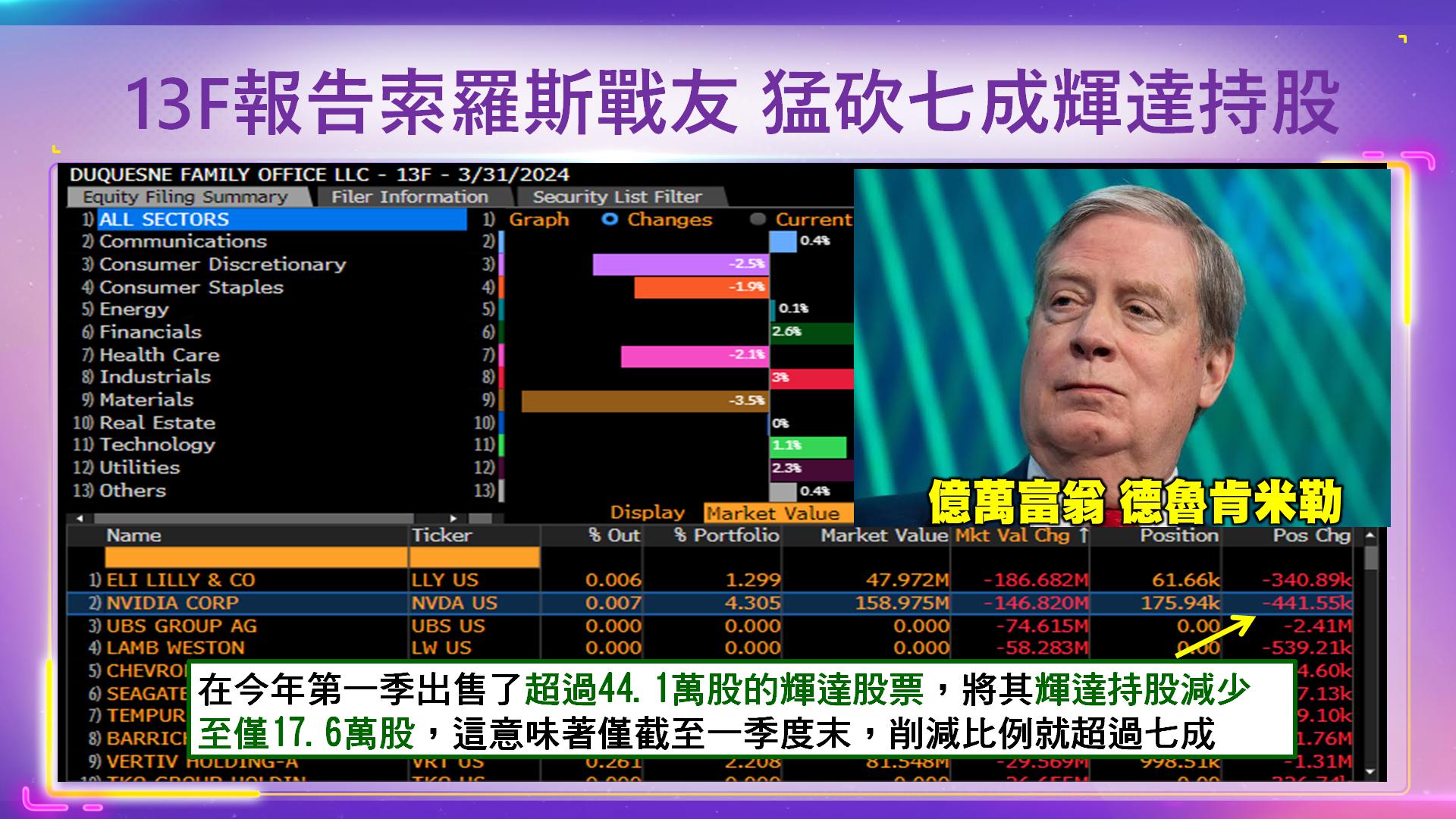 前索羅斯副手、億萬富翁德魯肯米勒2024/05/13:人工智慧熱潮可能被過度炒作了,他削減了許多輝達持倉。最新的13F文件給了相關重要線索。2024/05/13公布的13F文件顯示,德魯肯米勒的家族辦公室在2024年第一季出售了超過44.1萬股的輝達股票,將其輝達持股減少至僅17.6萬股,這意味著僅截至一季度末,削減比例就超過七成,剩餘輝達持股的價值約為1.58億美元。但13F文件具有時滯性,僅為截至一季度末,從德魯肯米勒上週的表態來看,他可能不會在二季度增加其輝達的持倉;相反地,完全有可能在進入二季度進一步削減輝達的持股。