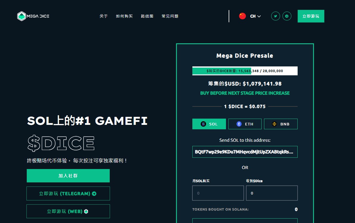 近日GambleFi領域再次迎來了一位新星——Mega Dice Token(DICE)。這一新推出的代幣已在預售階段就突破了100萬美元的大關,並且以其即將到來的空投活動吸引了極大的關注。DICE代幣的預售成功,不僅凸顯了市場對其獨特賭博主題代幣的高度需求,也為其後續的市場表現奠定了堅實的基礎。