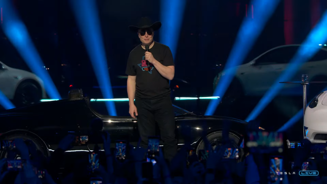 沒有了在上海和柏林的拘束,馬斯克卸去西裝,只簡單地身穿主題T卹、頭戴牛仔帽出現在了德州工廠的開業Party 上。