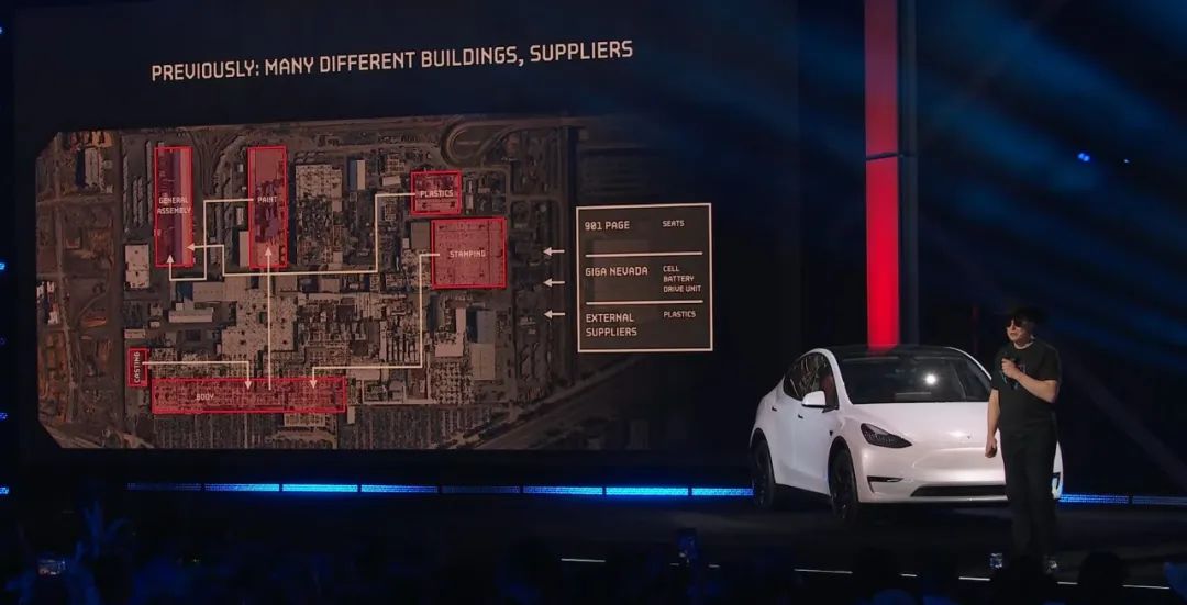 為了凸顯德州工廠這一佈局的先進性,馬斯克還搬出了多年前建立的Fremont 工廠進行比較。可以看到Fremont 佈局零散,許多不同的建築錯落分佈,相互之間的協同作業的效率看上去就不高。