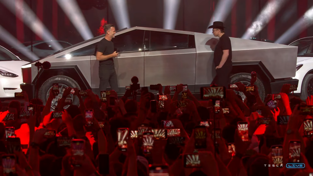 回憶起當年的「翻車」事件,馬斯克和Franz 調侃說:「今天我們要不要再砸一次玻璃?」伴隨著舞台下的一陣起哄,兩人終究還是沒有狠心像三年前一樣落下大錘。