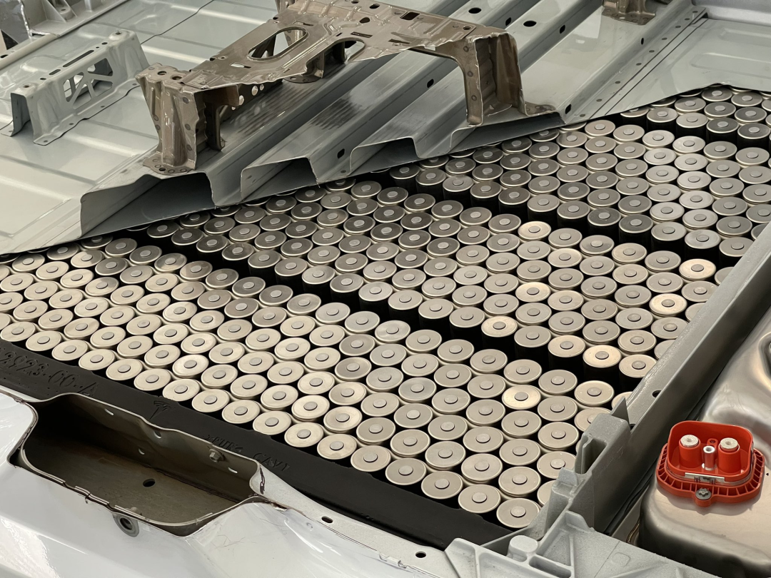 在工廠的展示區,隨處可見4680 的結構模型。不僅有單電芯的展示,還有電芯和底盤集成後的樣子,也就說只要車身和懸挂件就位,這些底盤就可以秒變成一部新車。