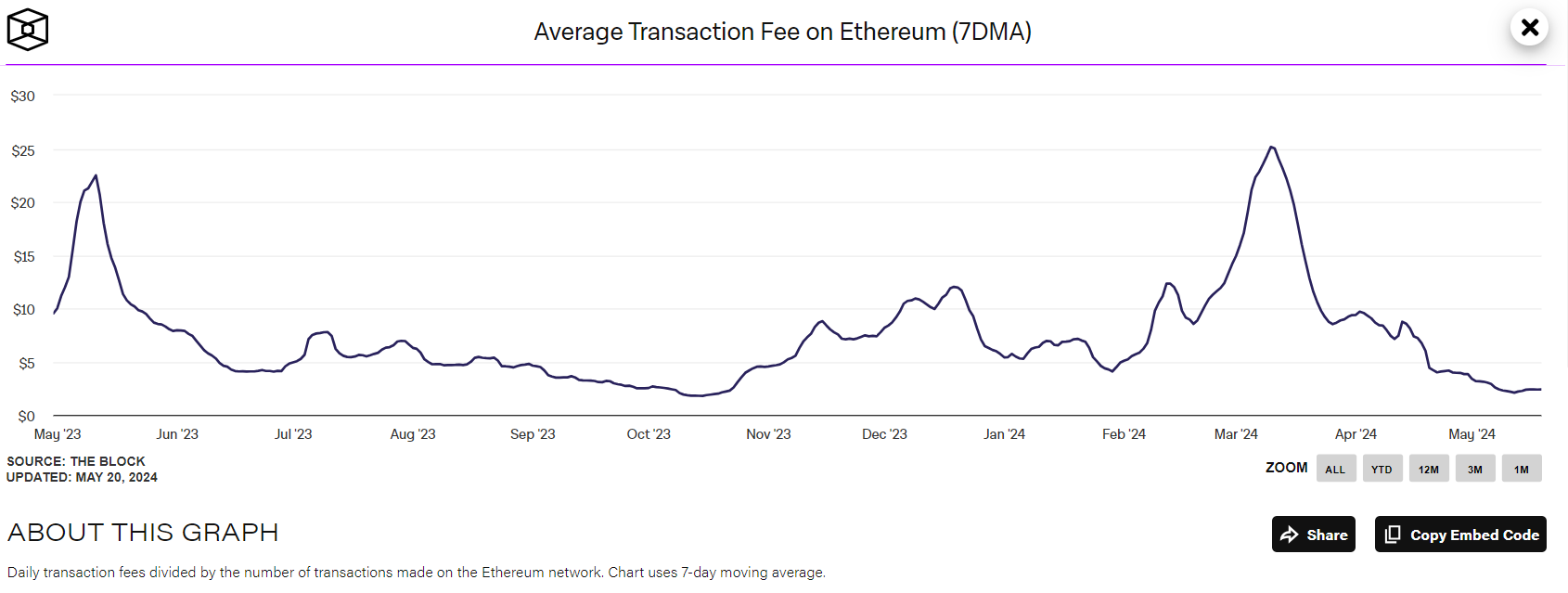 散戶資金回流以太坊是市場動態的顯著變化,此前幾個月Solana Meme Coin市場佔據主導地位。這主要可以歸因於自Dencun升級以來ETH Gas費用的大幅下降。