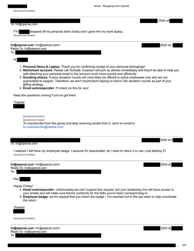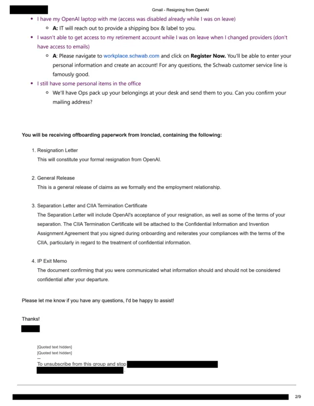 離職信裡明確寫道:「如果你有任何歸屬股權…你需要在60天內簽署放棄索賠協議,以保留這些股權。」這封信由Kwon和OpenAI的前人事副總裁Diane Yoon簽署,後者在最近也離開了OpenAI。