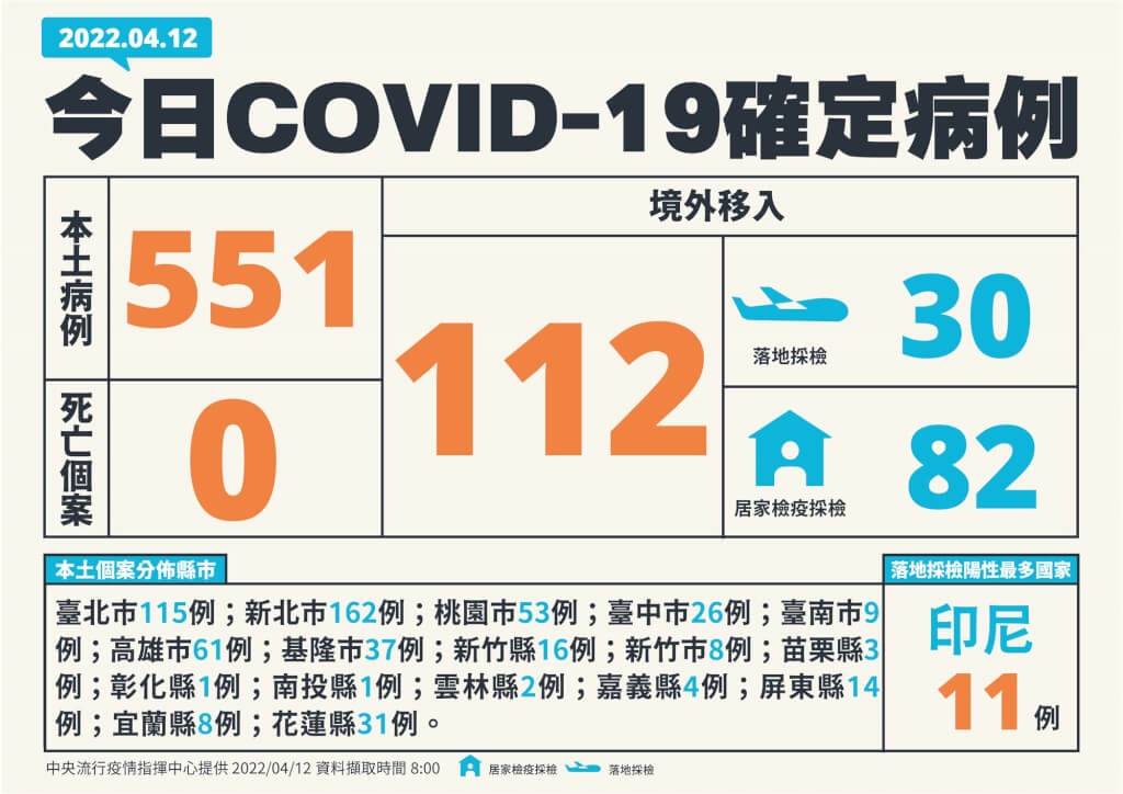 指揮中心表示,今日新增之551例本土病例,為291例男性、260例女性,年齡介於未滿5歲至90多歲,發病日介於今(2022)年4月4日至4月12日,其中包含242例為無症狀感染。