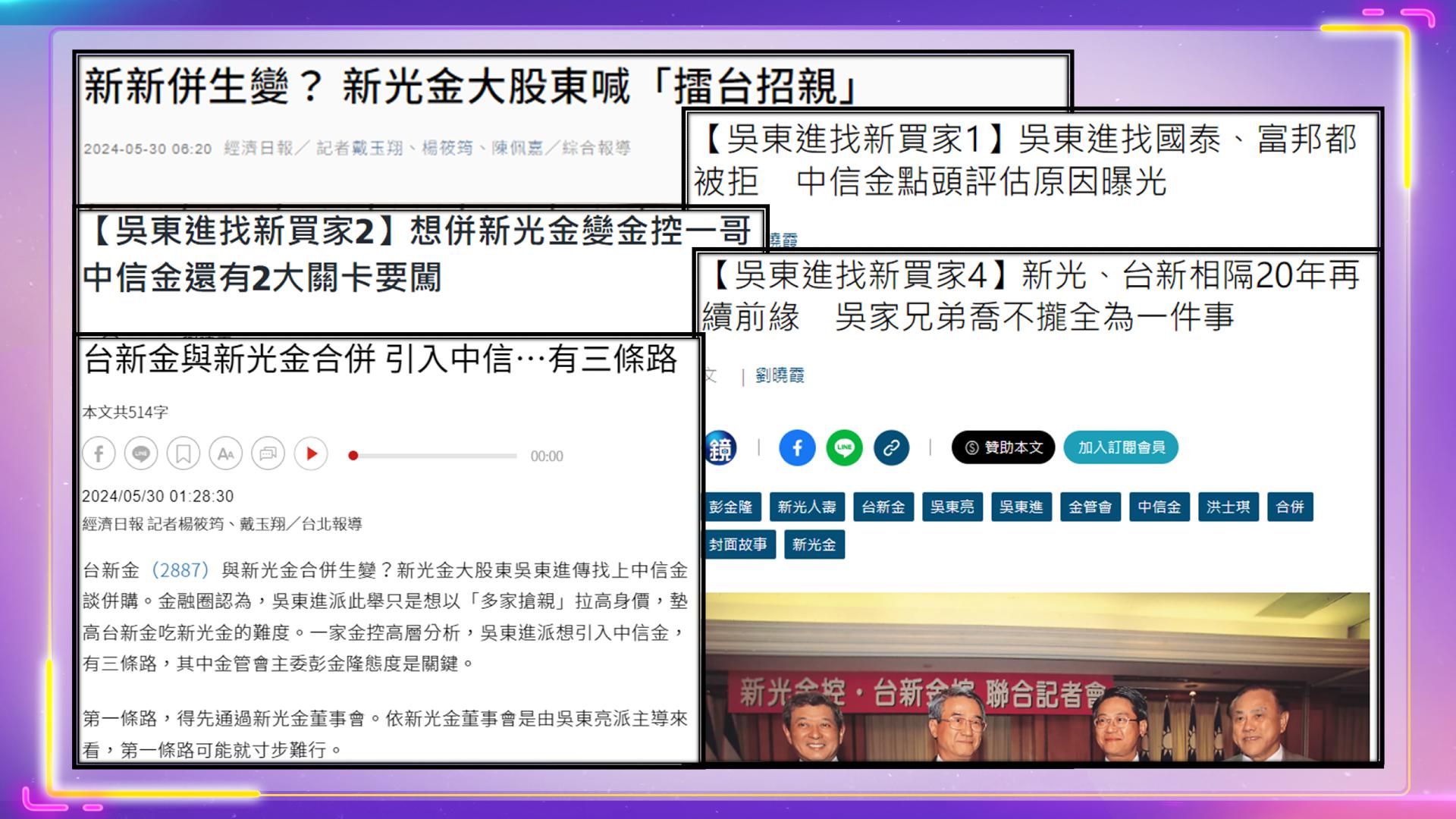知情人士透露,吳東進在市場積極尋找金主,希望能引進外援,解決新壽增資、新光金台新金合併案二大難題;吳東進私下探詢過國泰蔡家、富邦蔡家和中信辜家意願,國泰和富邦皆表態,除了不願介入吳家紛爭外,另外就是認為併購新光金,對國泰金、富邦金沒有加分